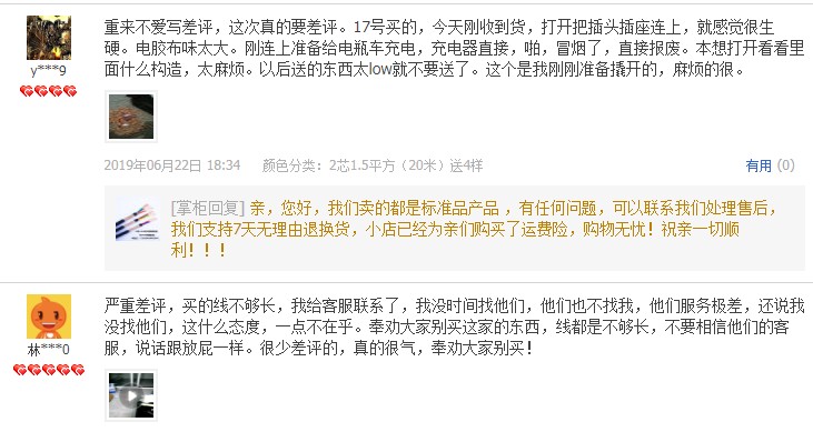 評價截圖有很多,我這邊就不一 一發(fā)出來了,總結(jié)幾個特征,冒充國標,截面積虛標,米數(shù)不足,導體斷線,鋁鍍銅,這個就是低價的本質(zhì),如果你是買回家當擺設并且不怕刺鼻味的,盡可能多買點,其余用途作為晾衣繩都怕斷。